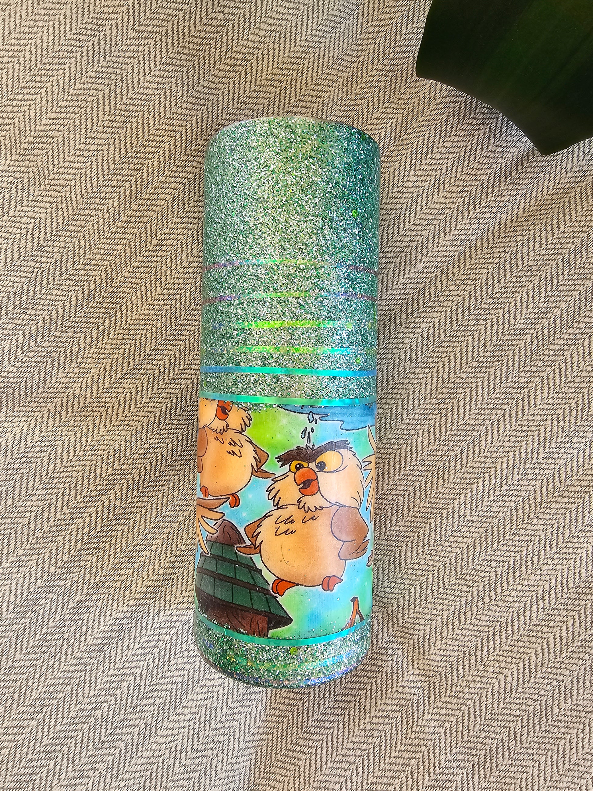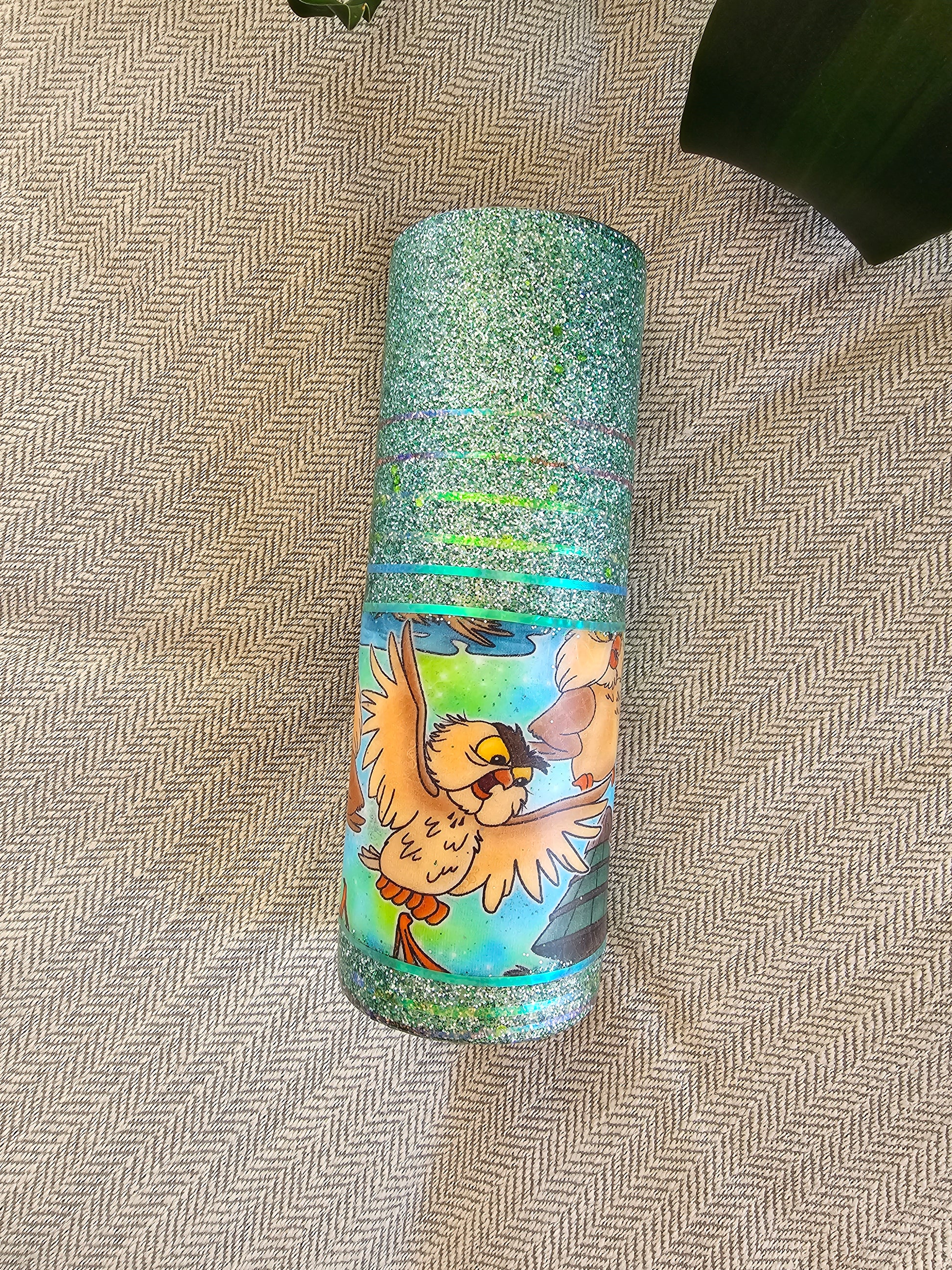 20 oz skinny tumbler with custom fabric and glitter, sealed with non toxic coating. Handle with care.