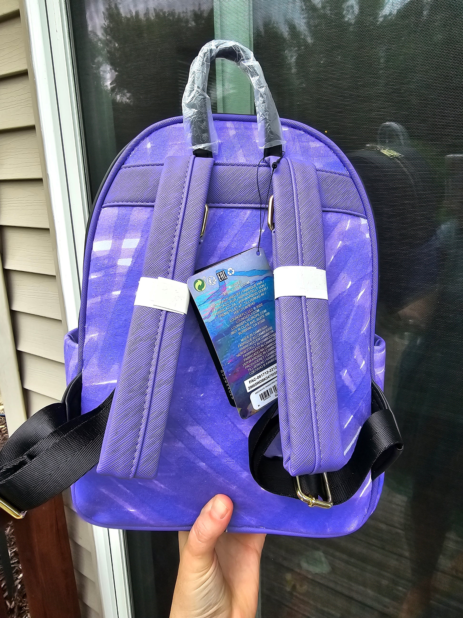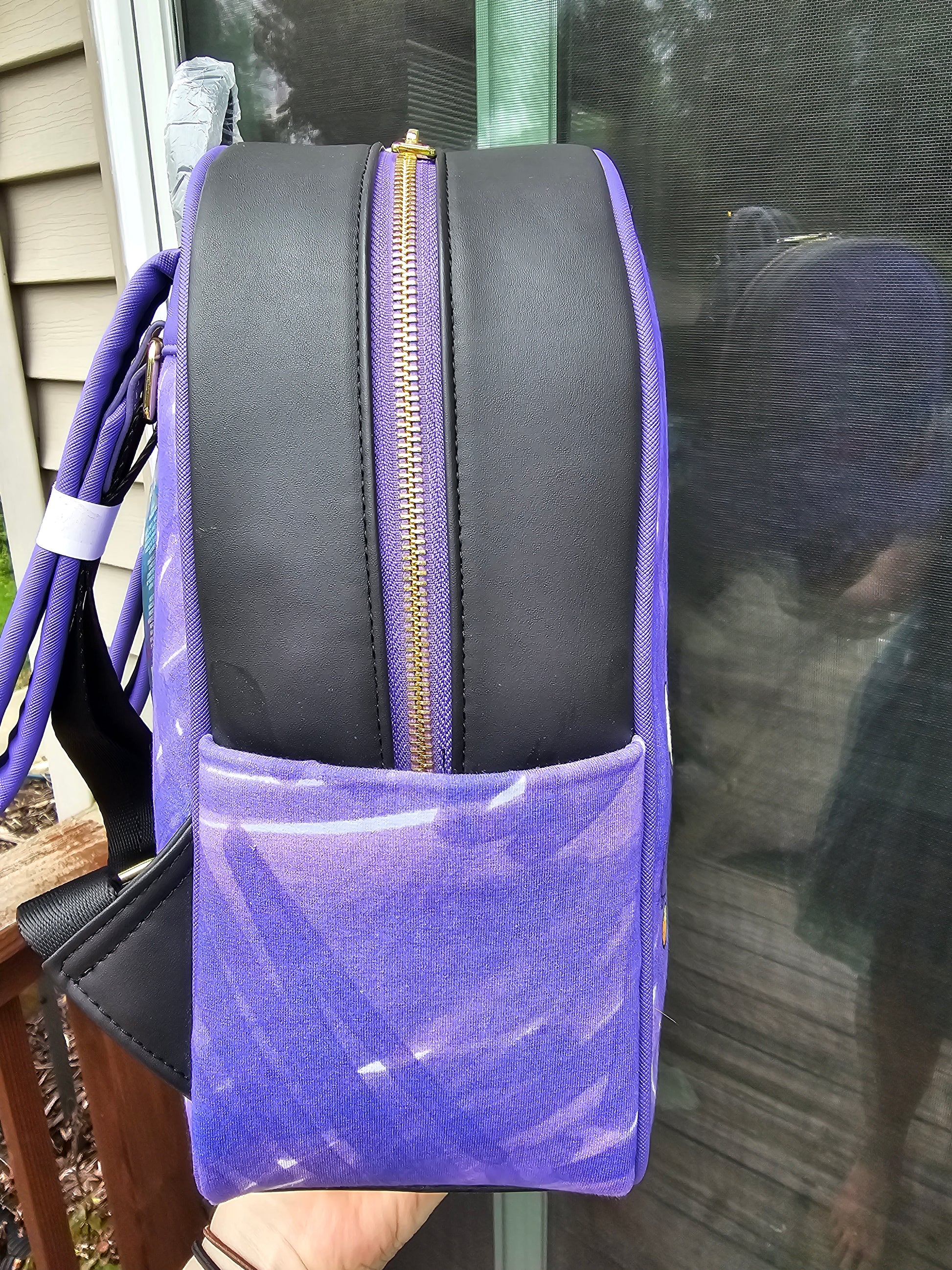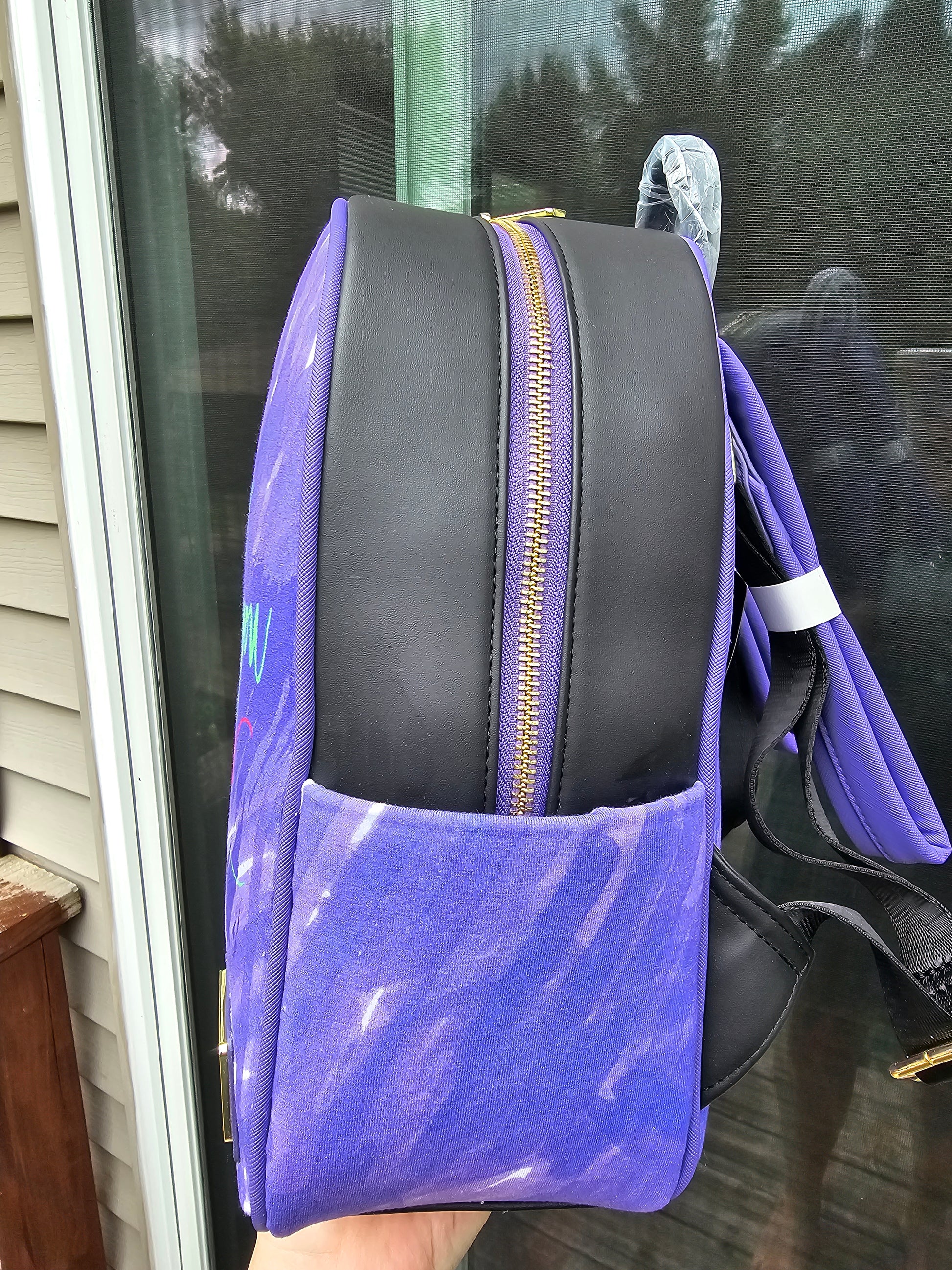 Custom fabric has been placed on the outside of the mini backpack. The inside lining remains the same as the original bag.