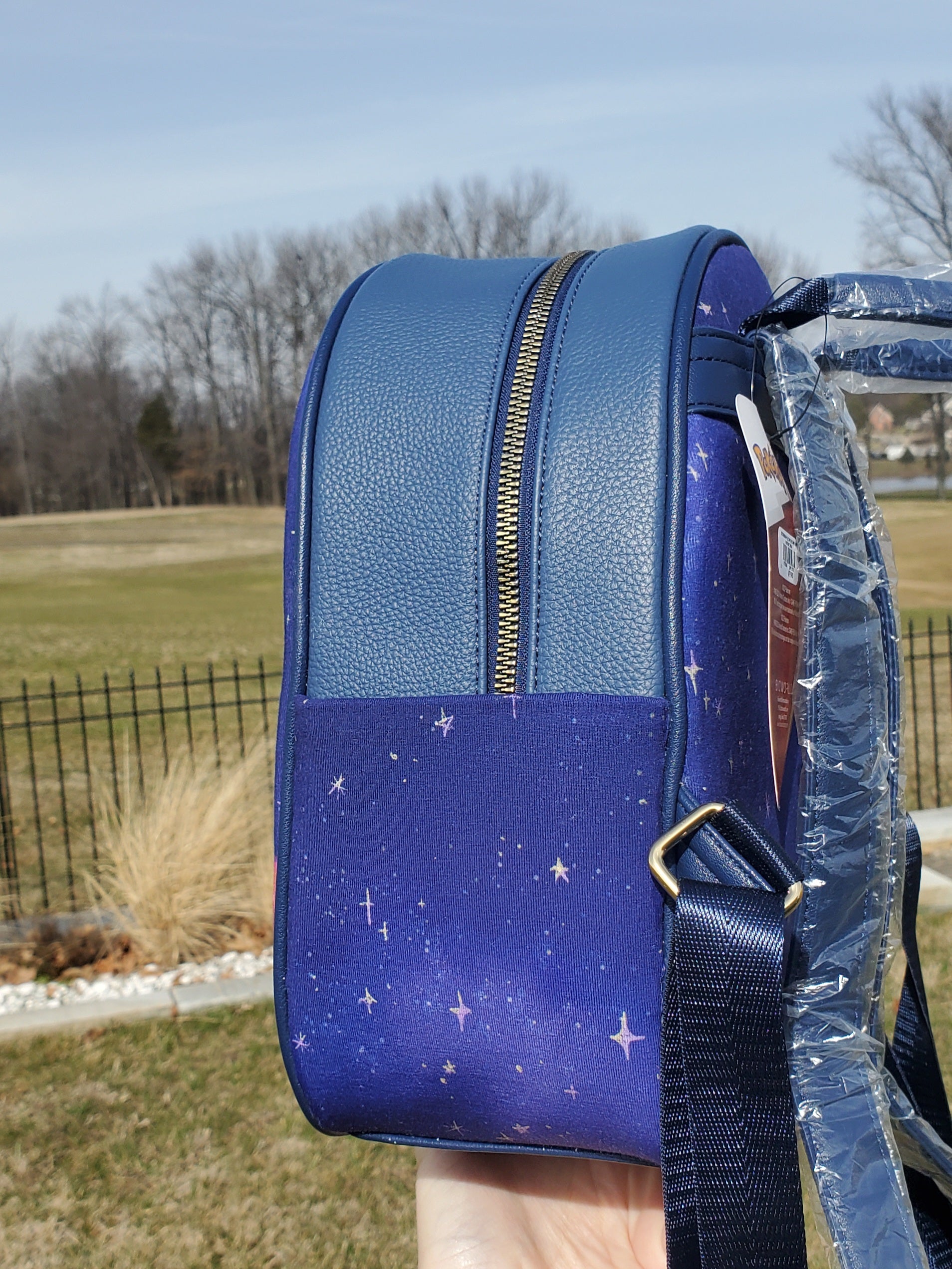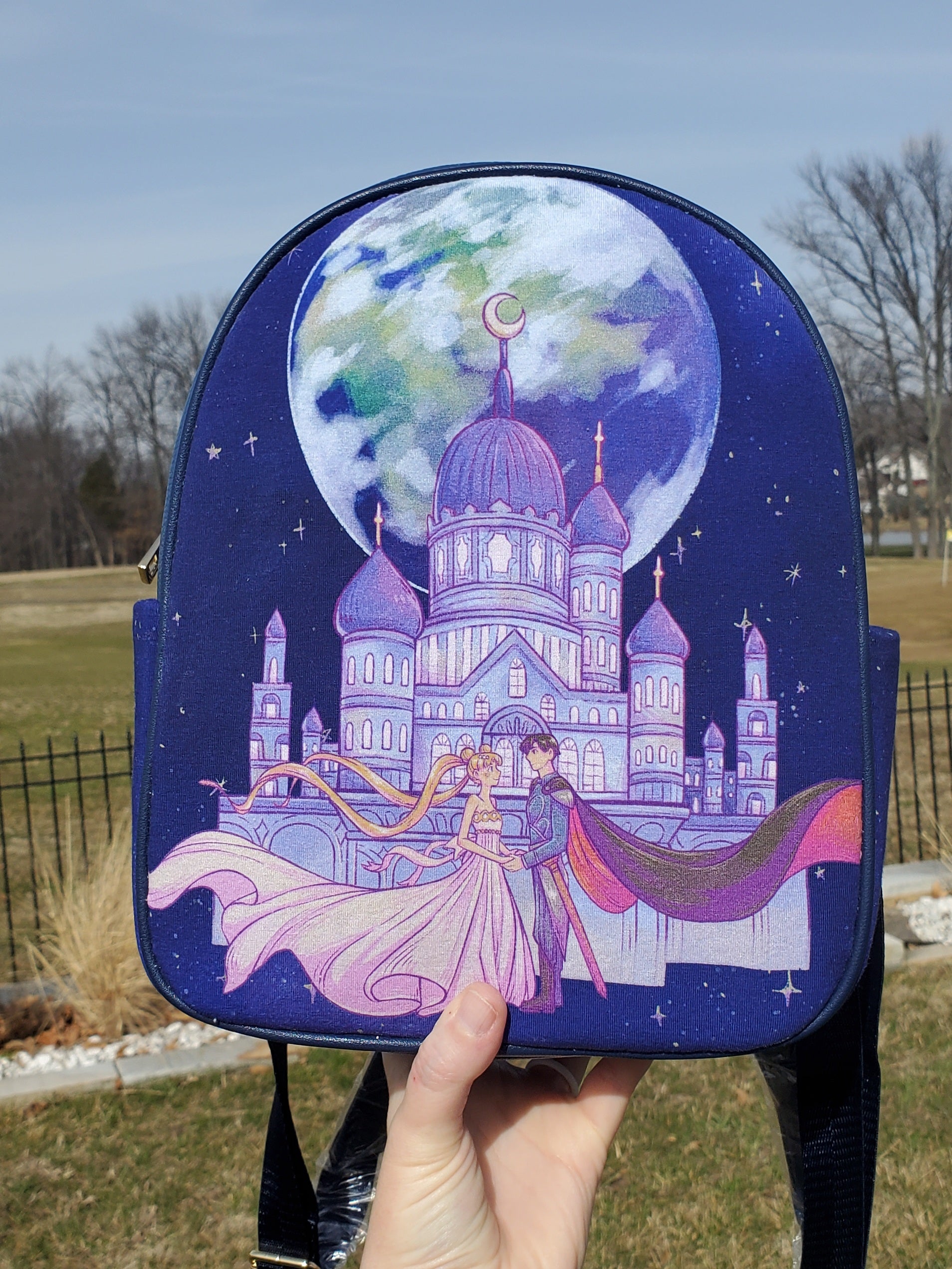 Custom fabric has been placed on the outside of the mini backpack. The inside lining remains the same as the original bag.