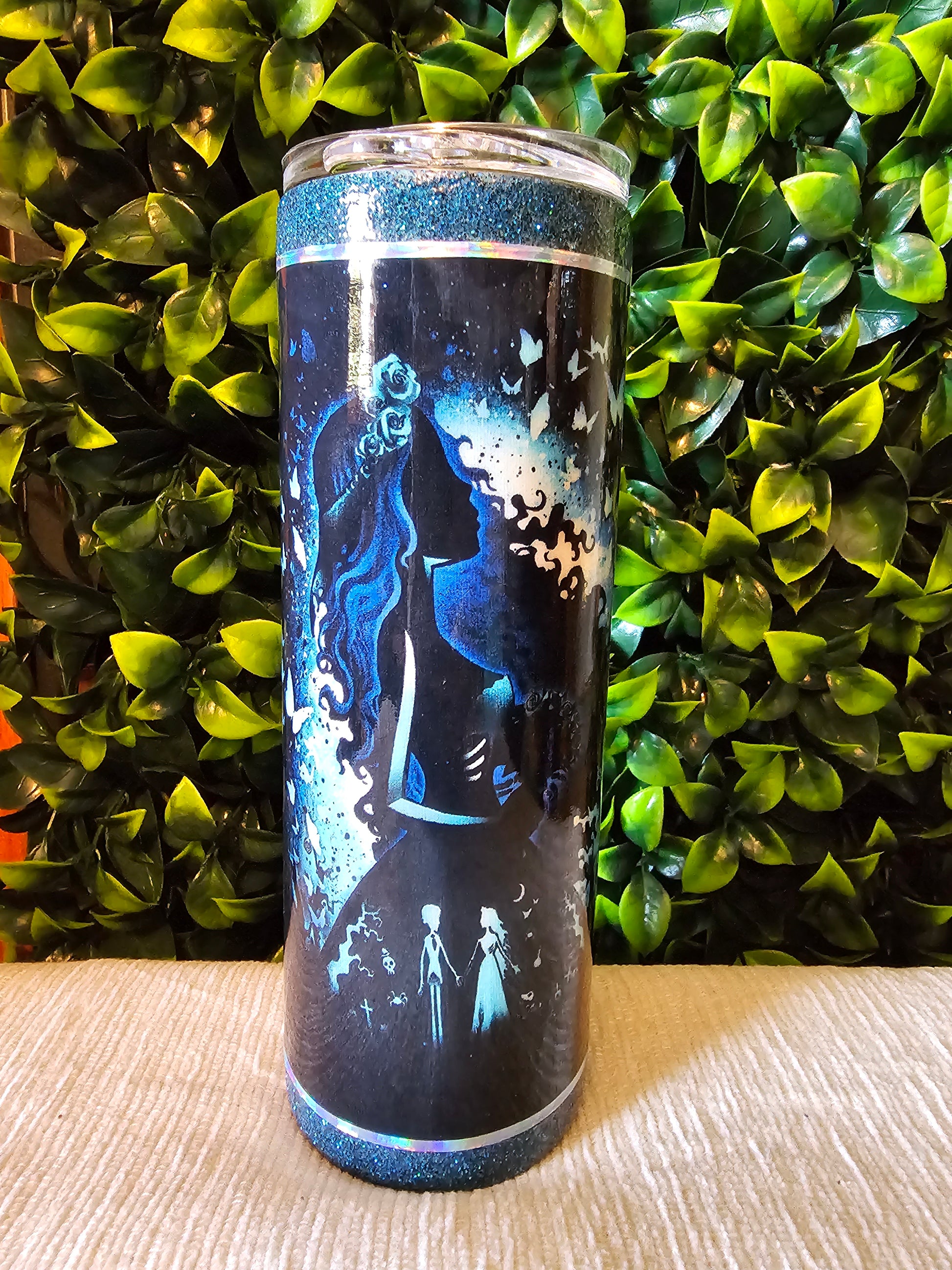 20 oz skinny stainless tumbler. Made with custom fabric and sealed with non epoxy, non toxic coating. Includes lid and straw.