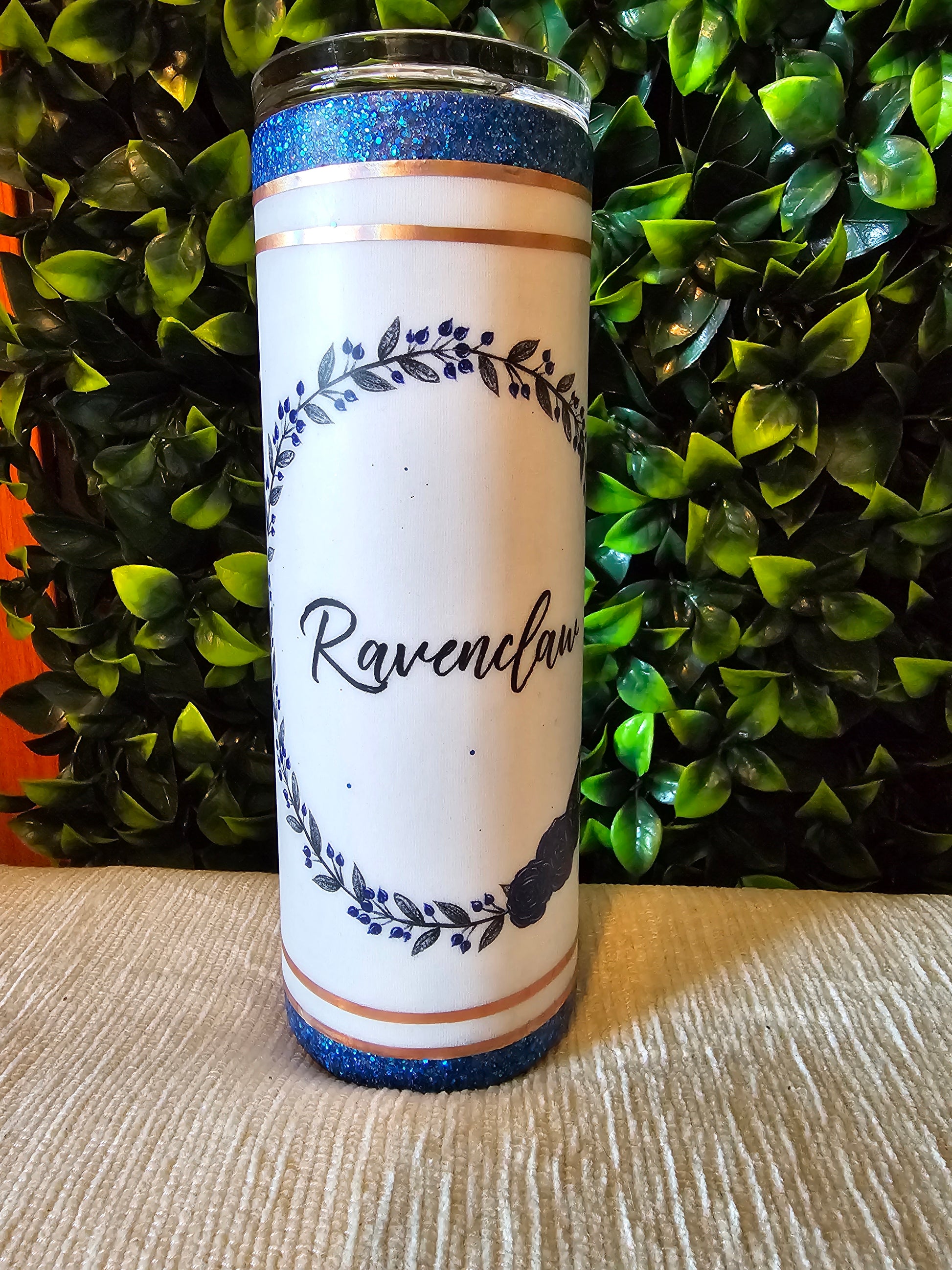 20 oz skinny stainless tumbler. Made with custom fabric and sealed with non epoxy, non toxic coating. Includes lid and straw.