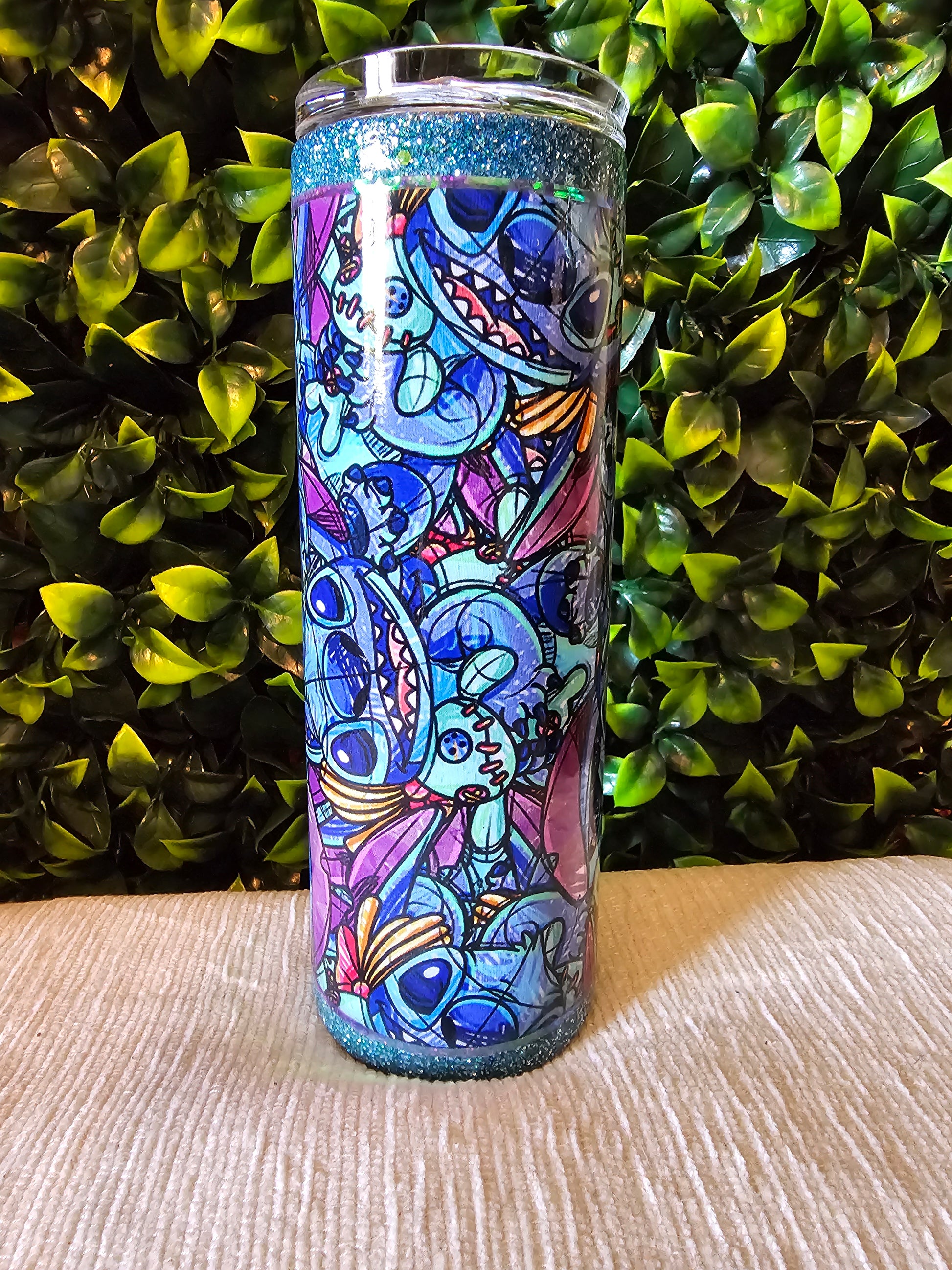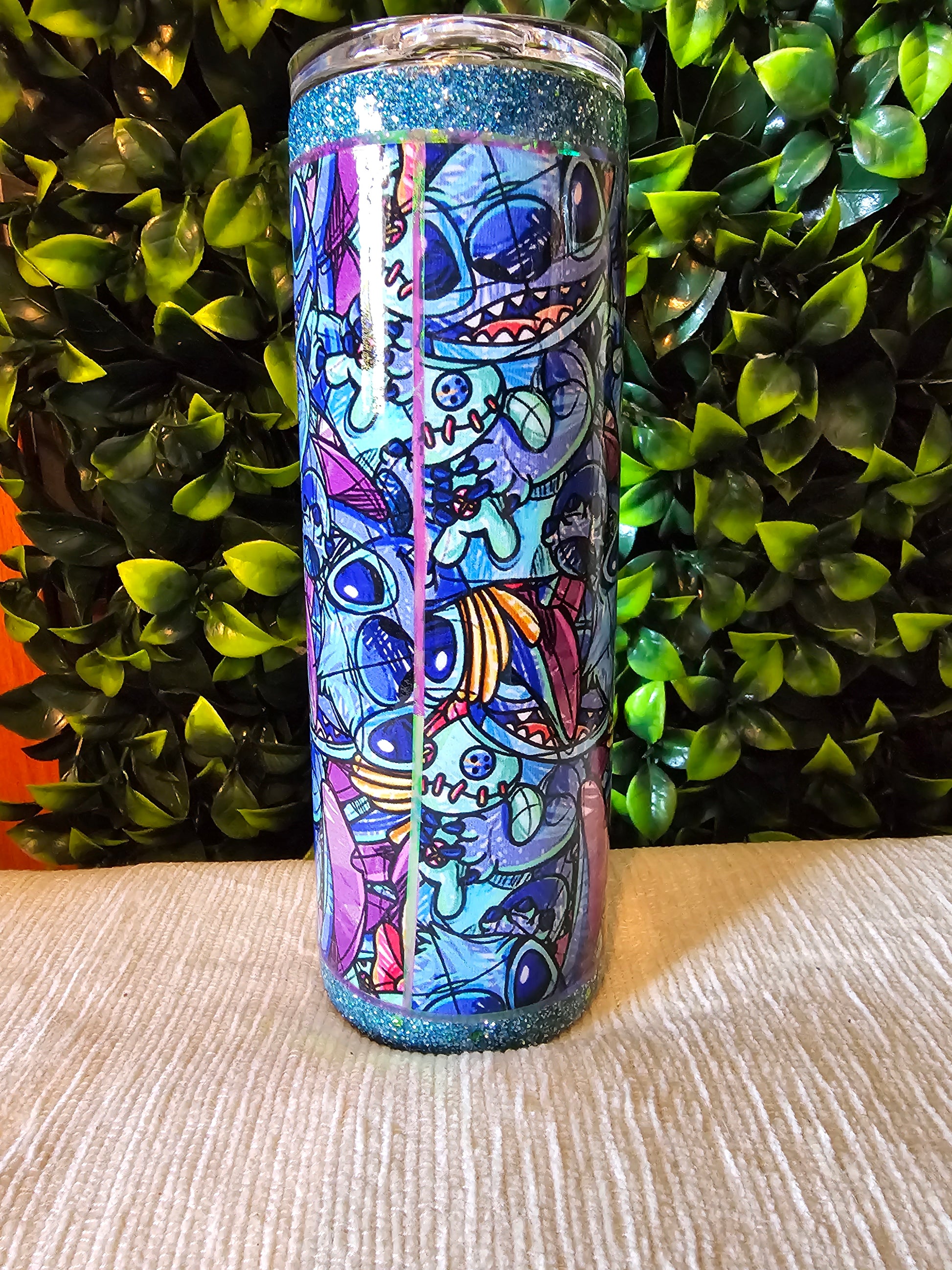 20 oz skinny stainless tumbler. Made with custom fabric and sealed with non epoxy, non toxic coating. Includes lid and straw.