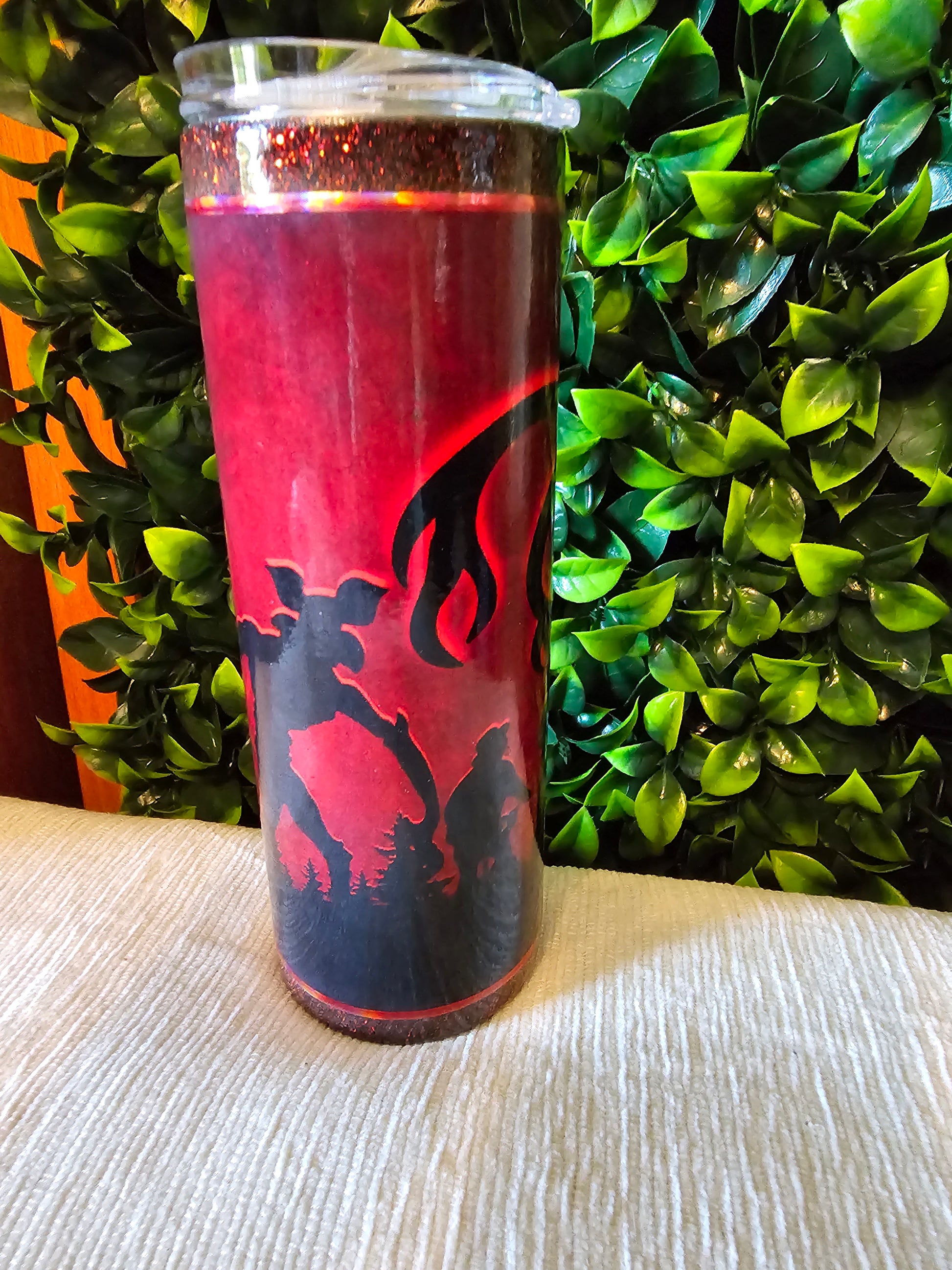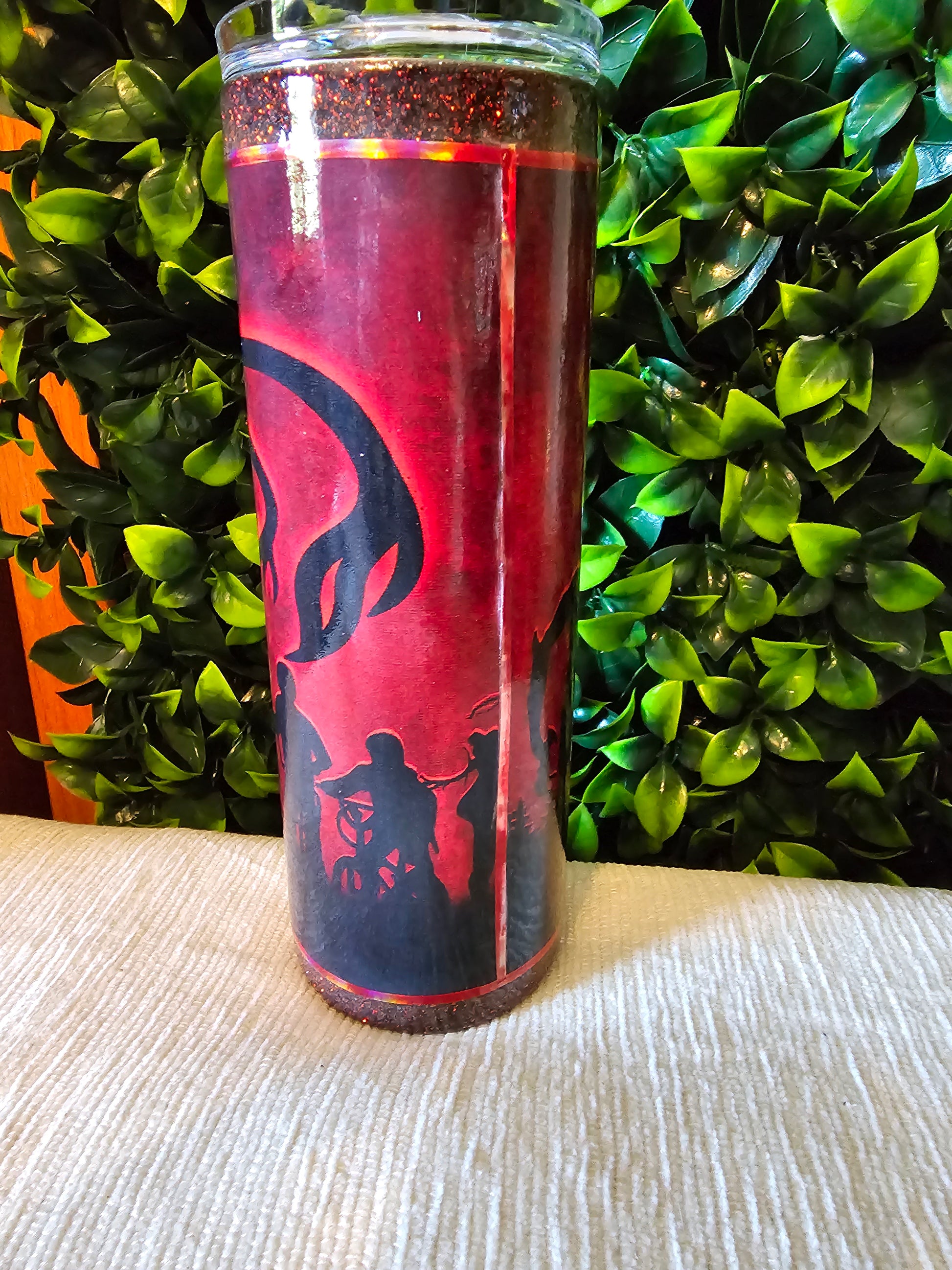 20 oz skinny stainless tumbler. Made with custom fabric and sealed with non epoxy, non toxic coating. Includes lid and straw.