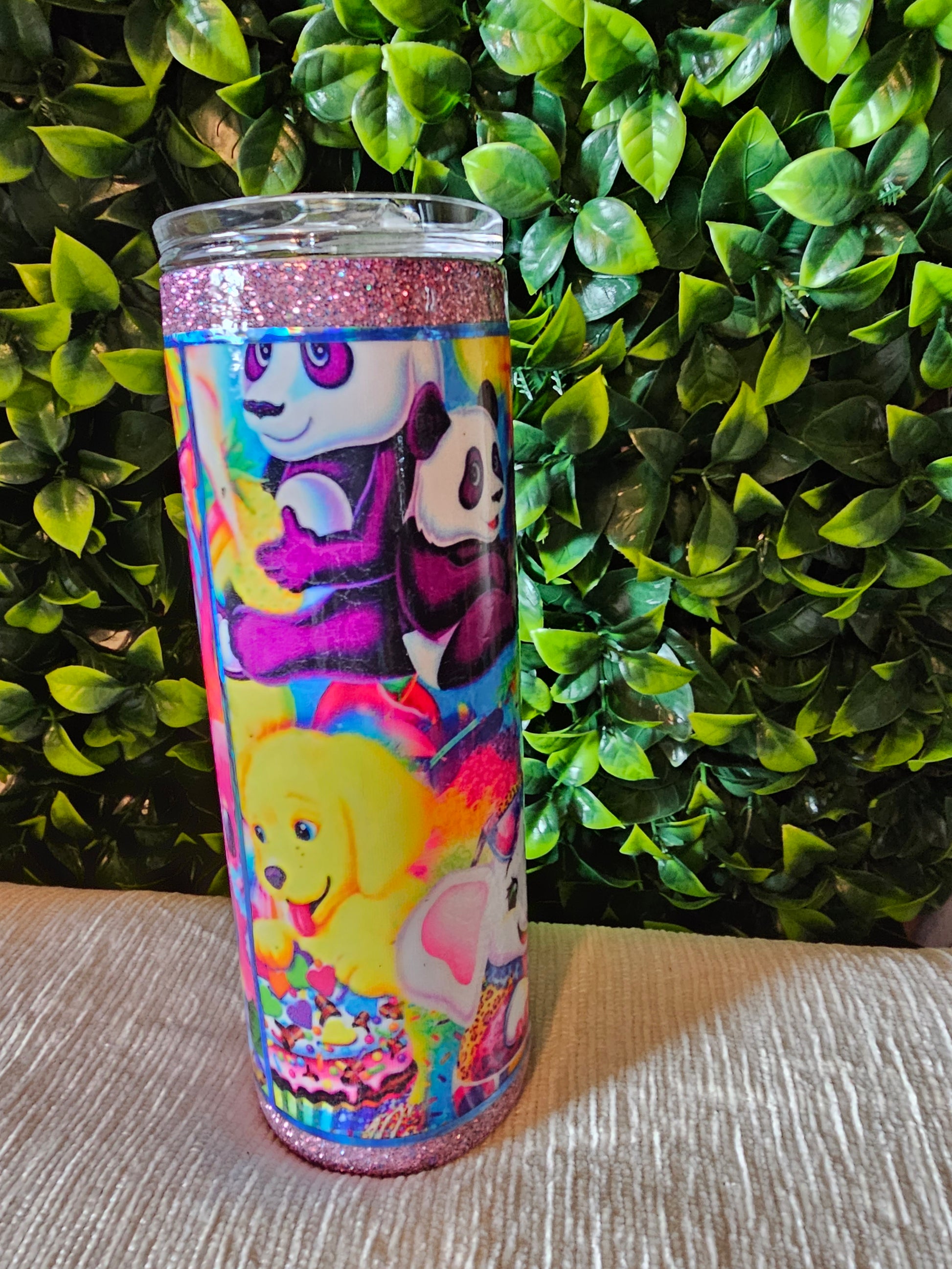 20 oz skinny stainless tumbler. Made with custom fabric and sealed with non epoxy, non toxic coating. Includes lid and straw.