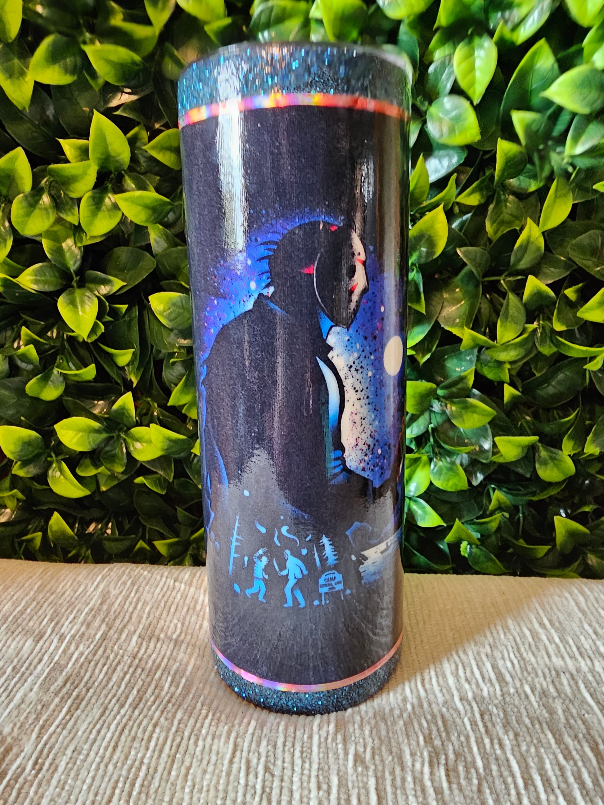 20 oz skinny stainless tumbler. Made with custom fabric and sealed with non epoxy, non toxic coating. Includes lid and straw.