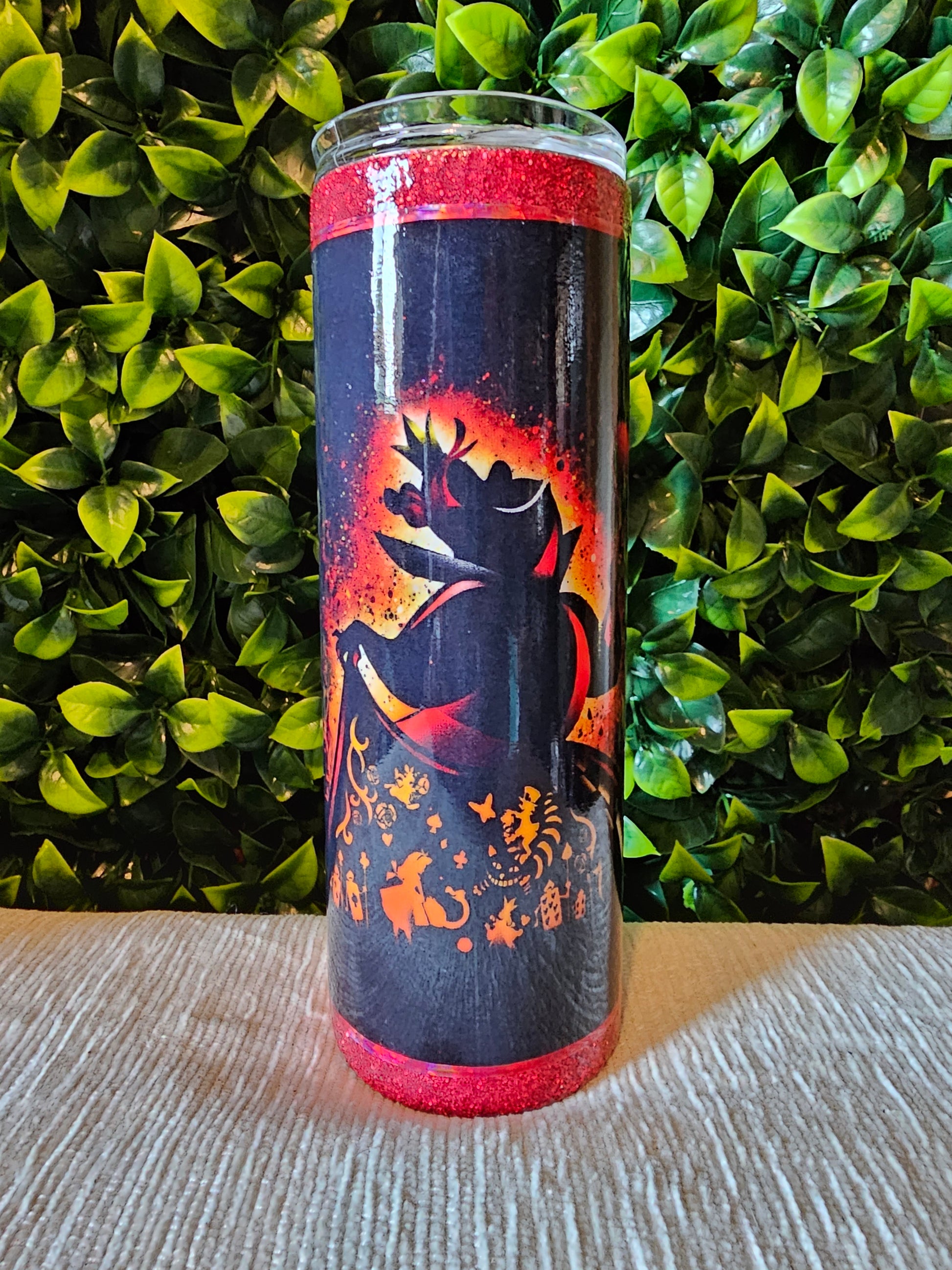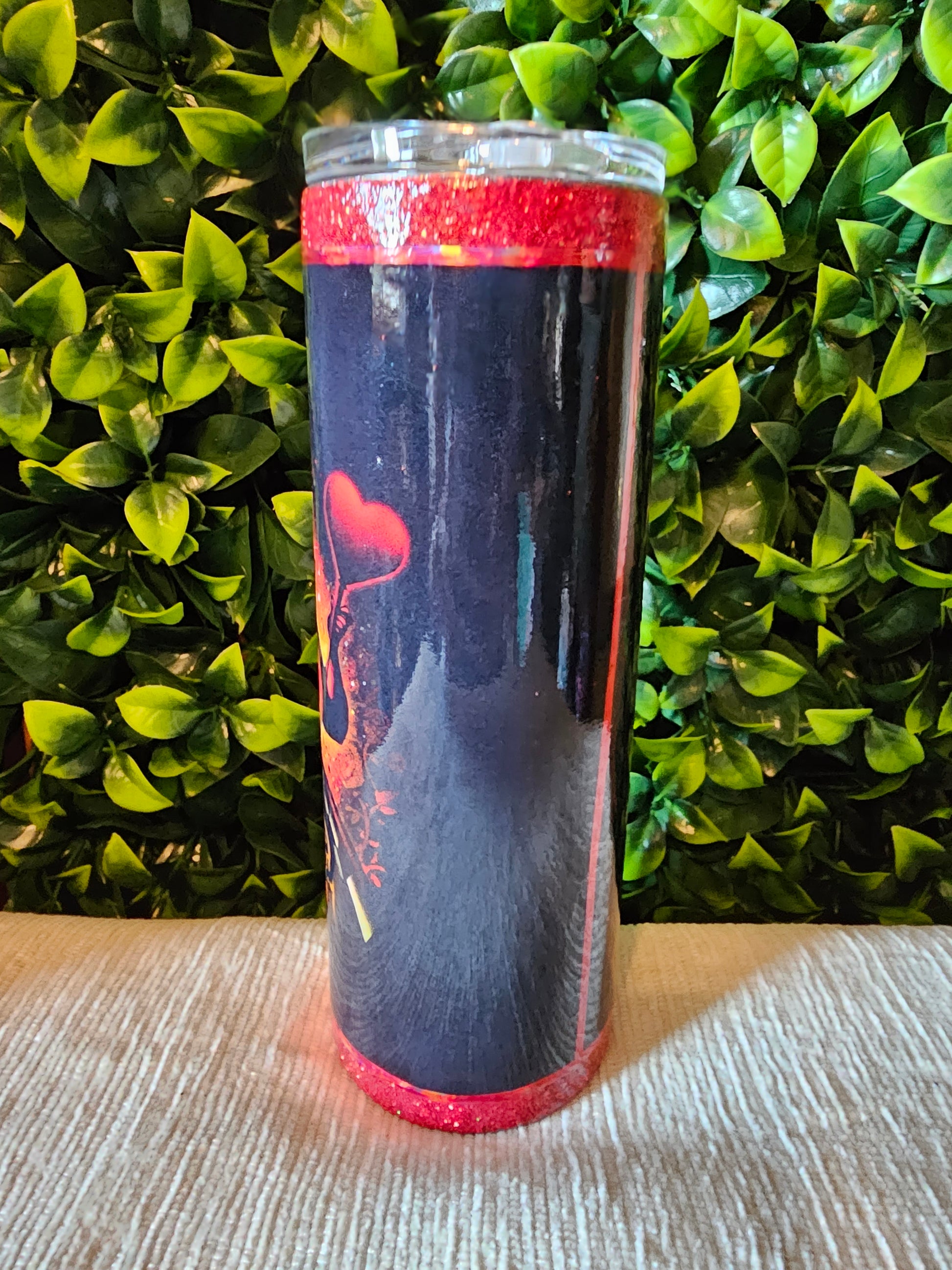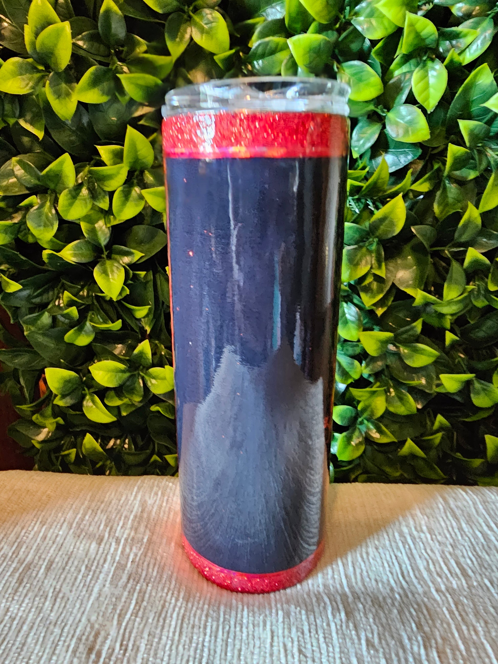 20 oz skinny stainless tumbler. Made with custom fabric and sealed with non epoxy, non toxic coating. Includes lid and straw.