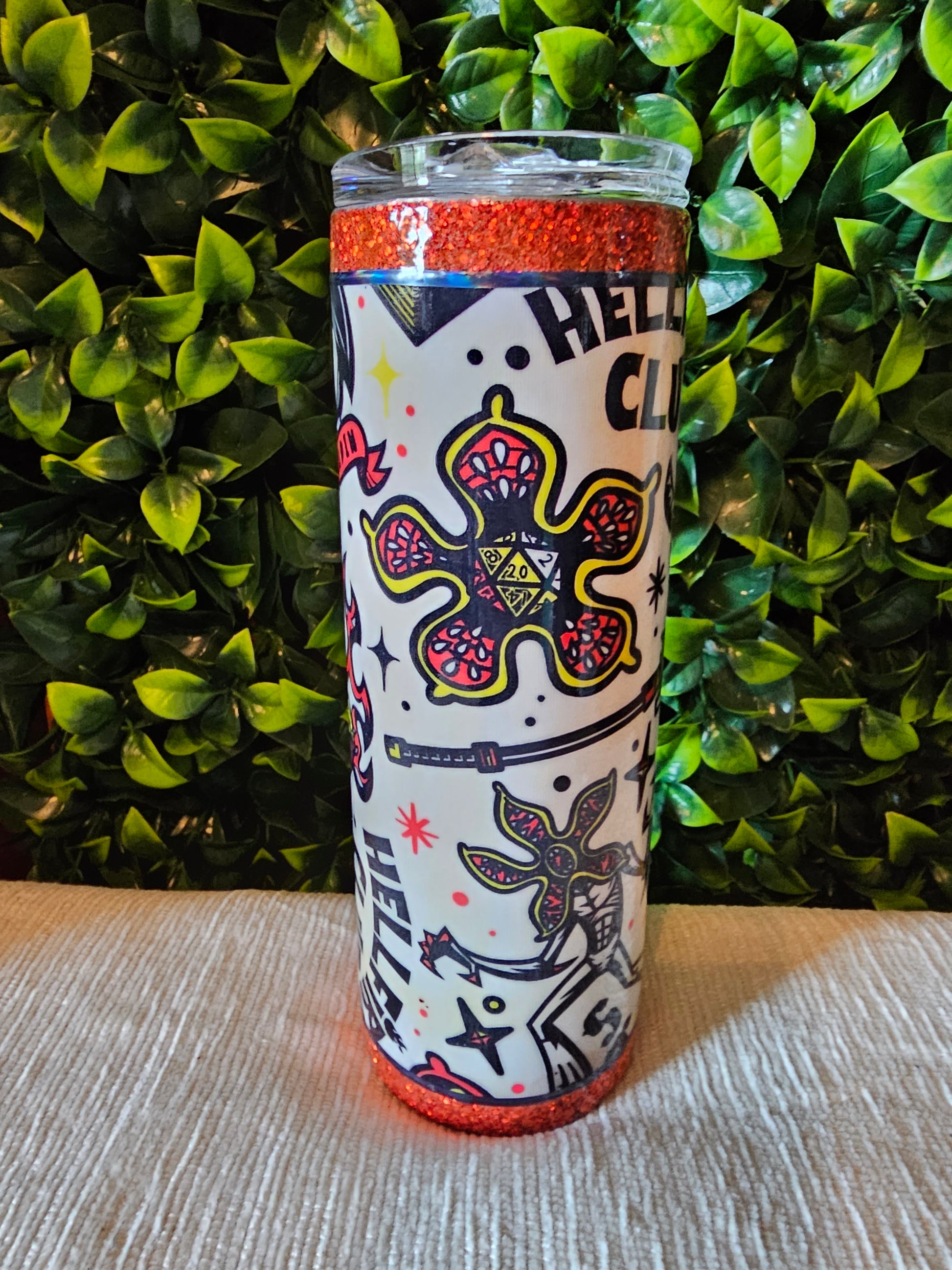 20 oz skinny stainless tumbler. Made with custom fabric and sealed with non epoxy, non toxic coating. Includes lid and straw.