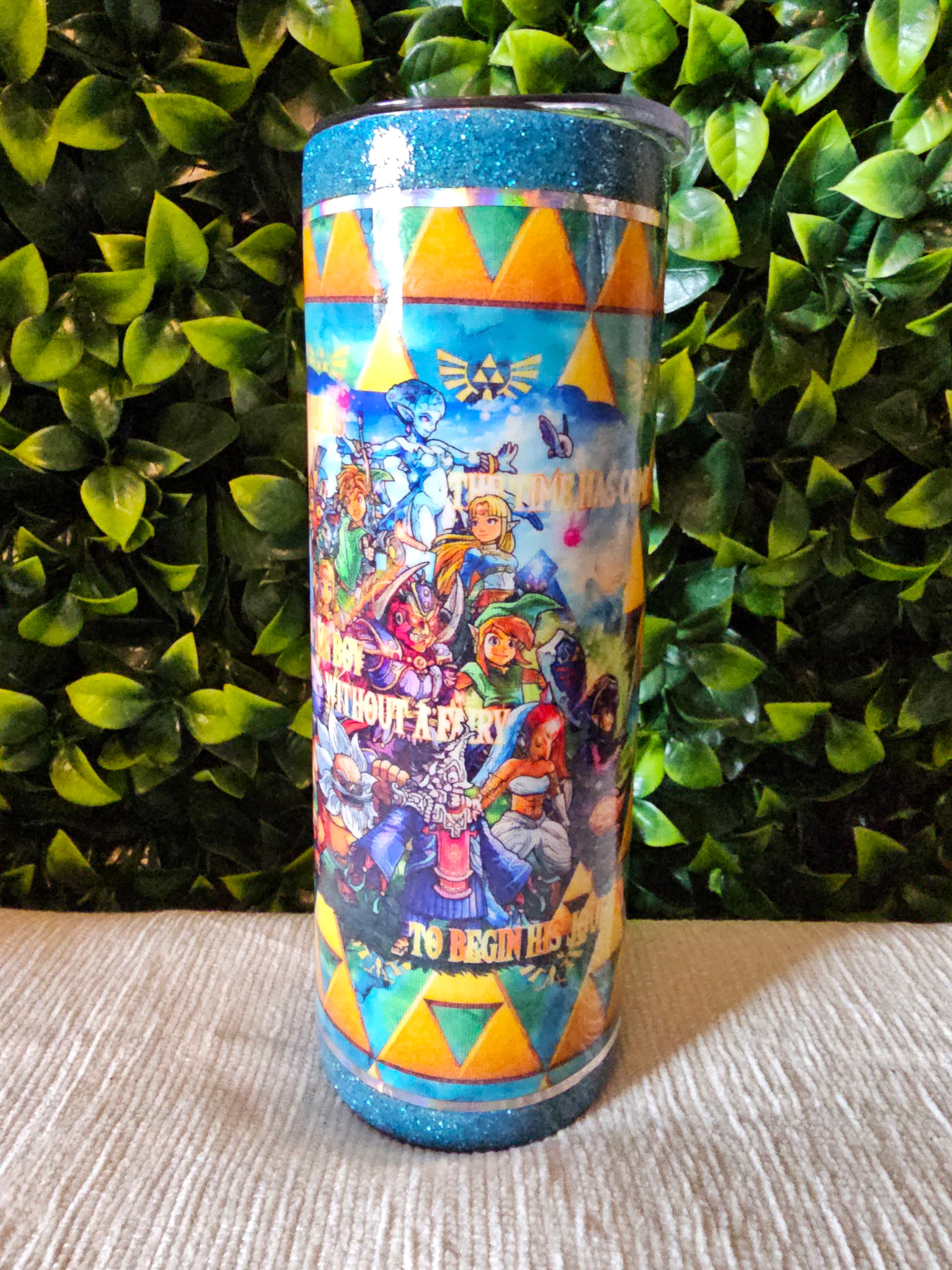 20 oz skinny stainless tumbler. Made with custom fabric and sealed with non epoxy, non toxic coating. Includes lid and straw.
