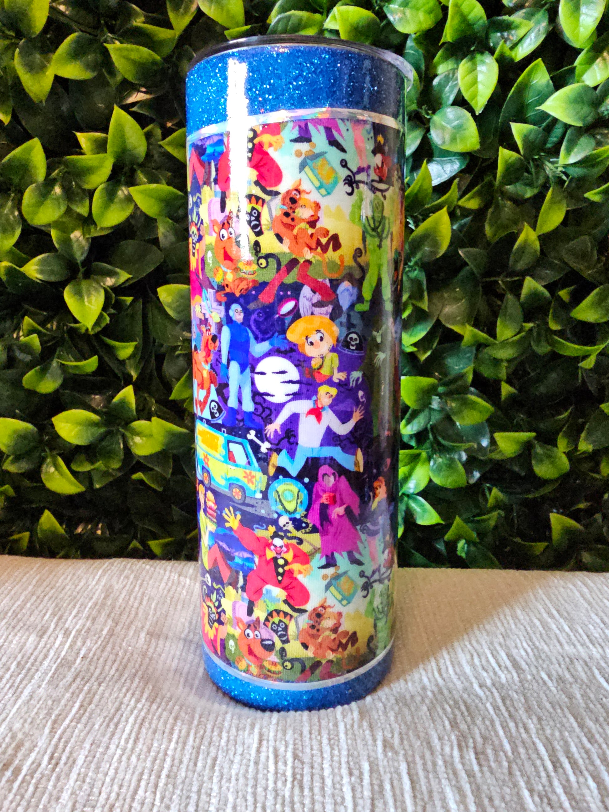20 oz skinny stainless tumbler. Made with custom fabric and sealed with non epoxy, non toxic coating. Includes lid and straw.