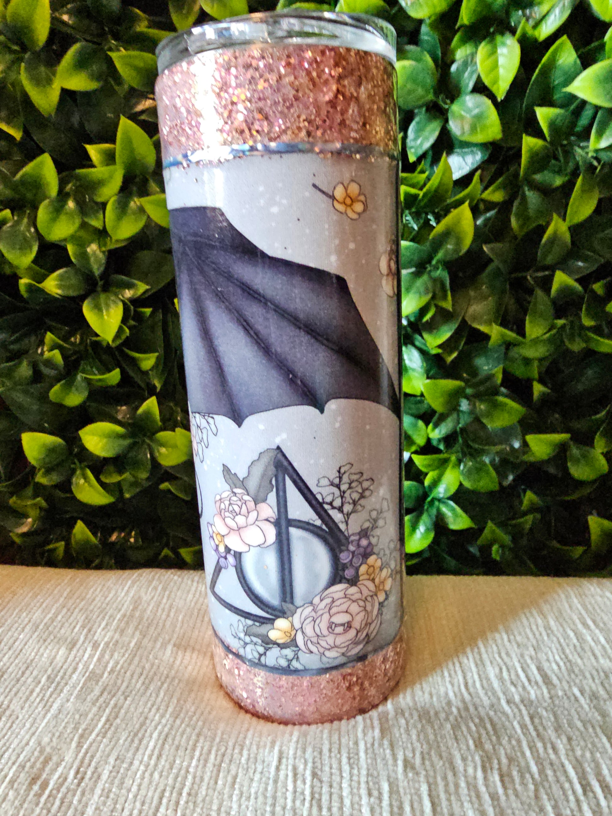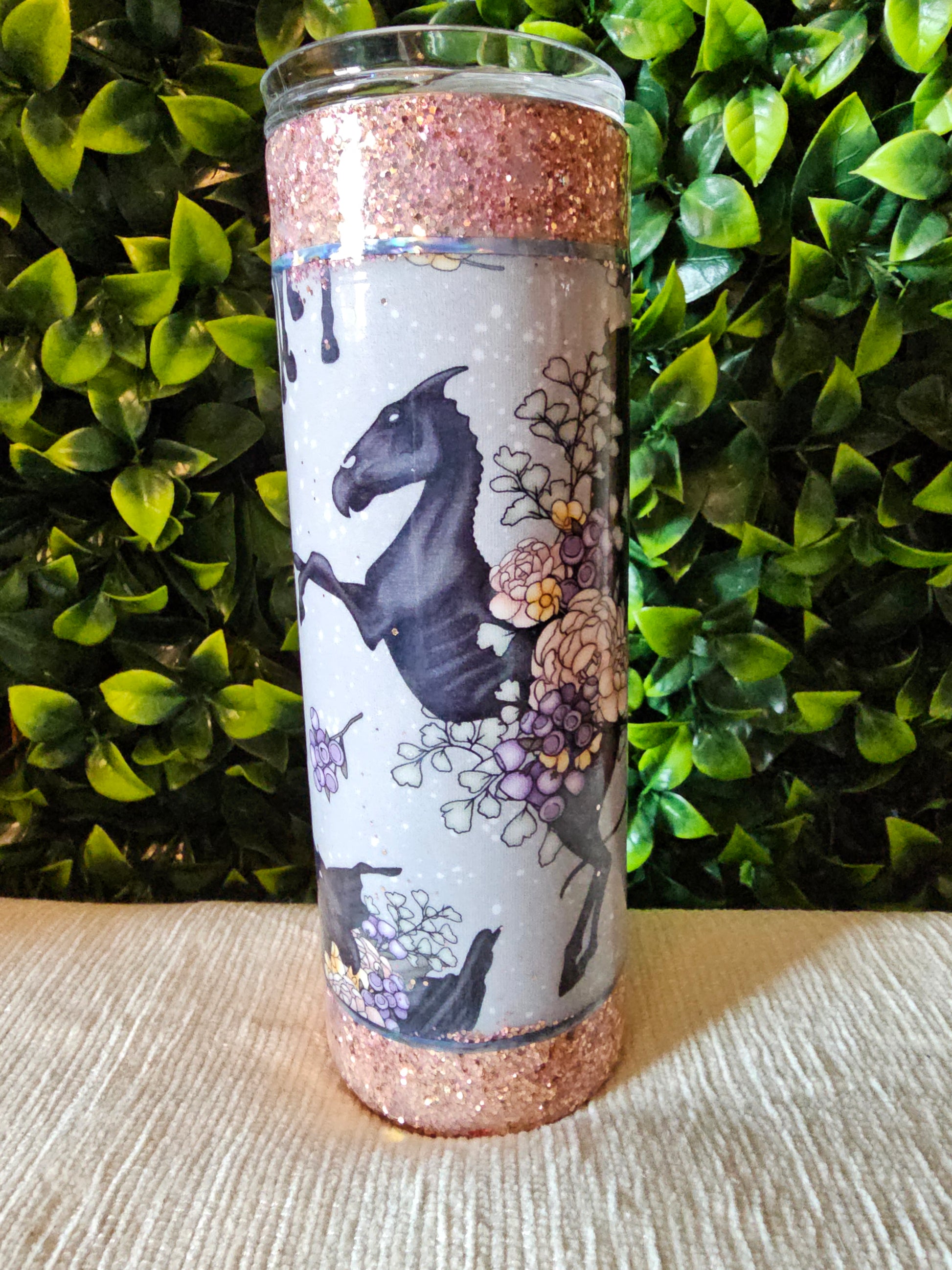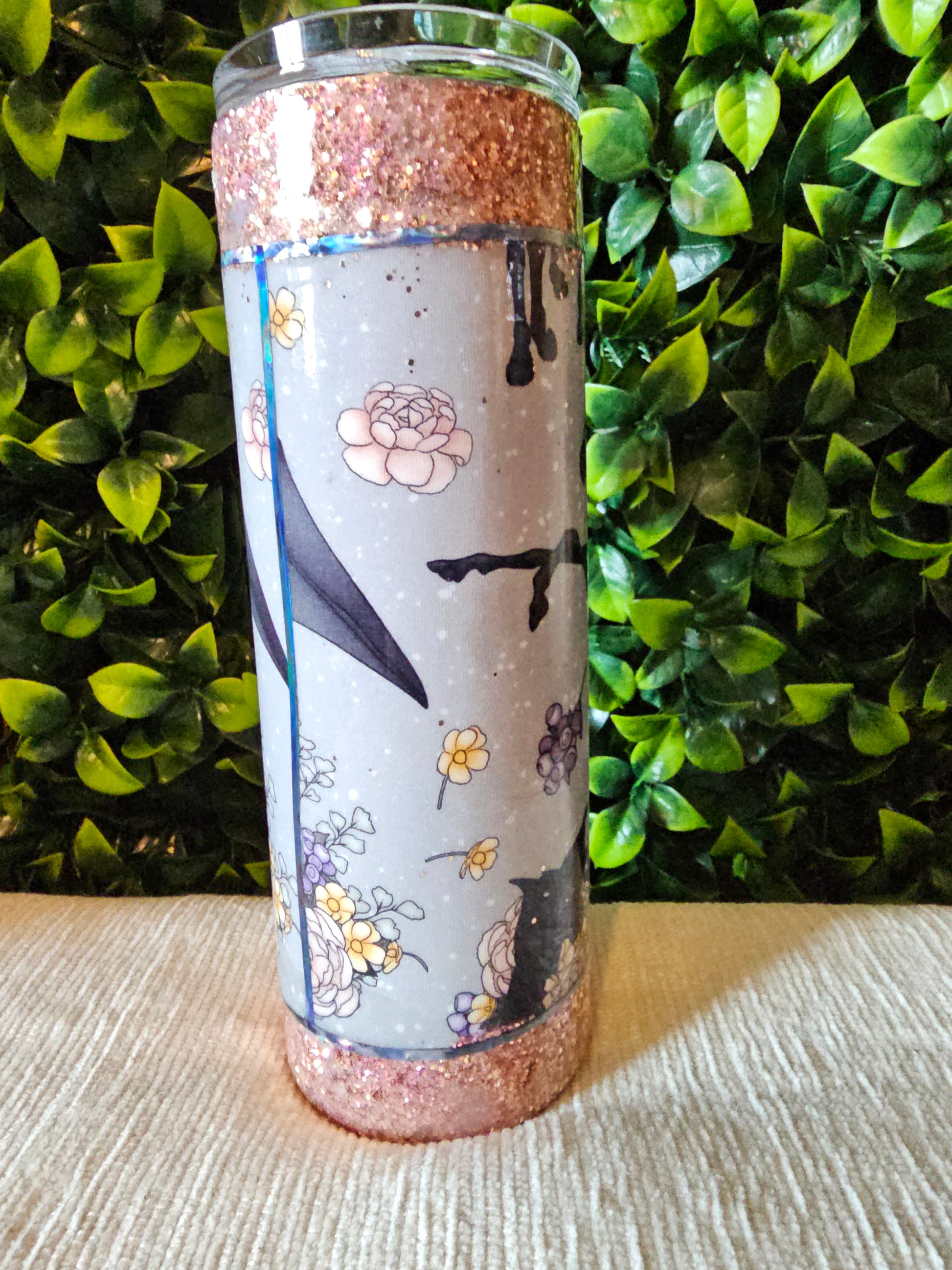 20 oz skinny stainless tumbler. Made with custom fabric and sealed with non epoxy, non toxic coating. Includes lid and straw.
