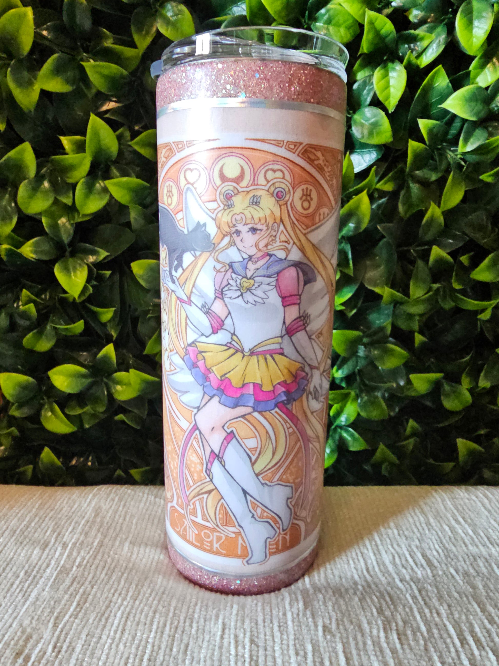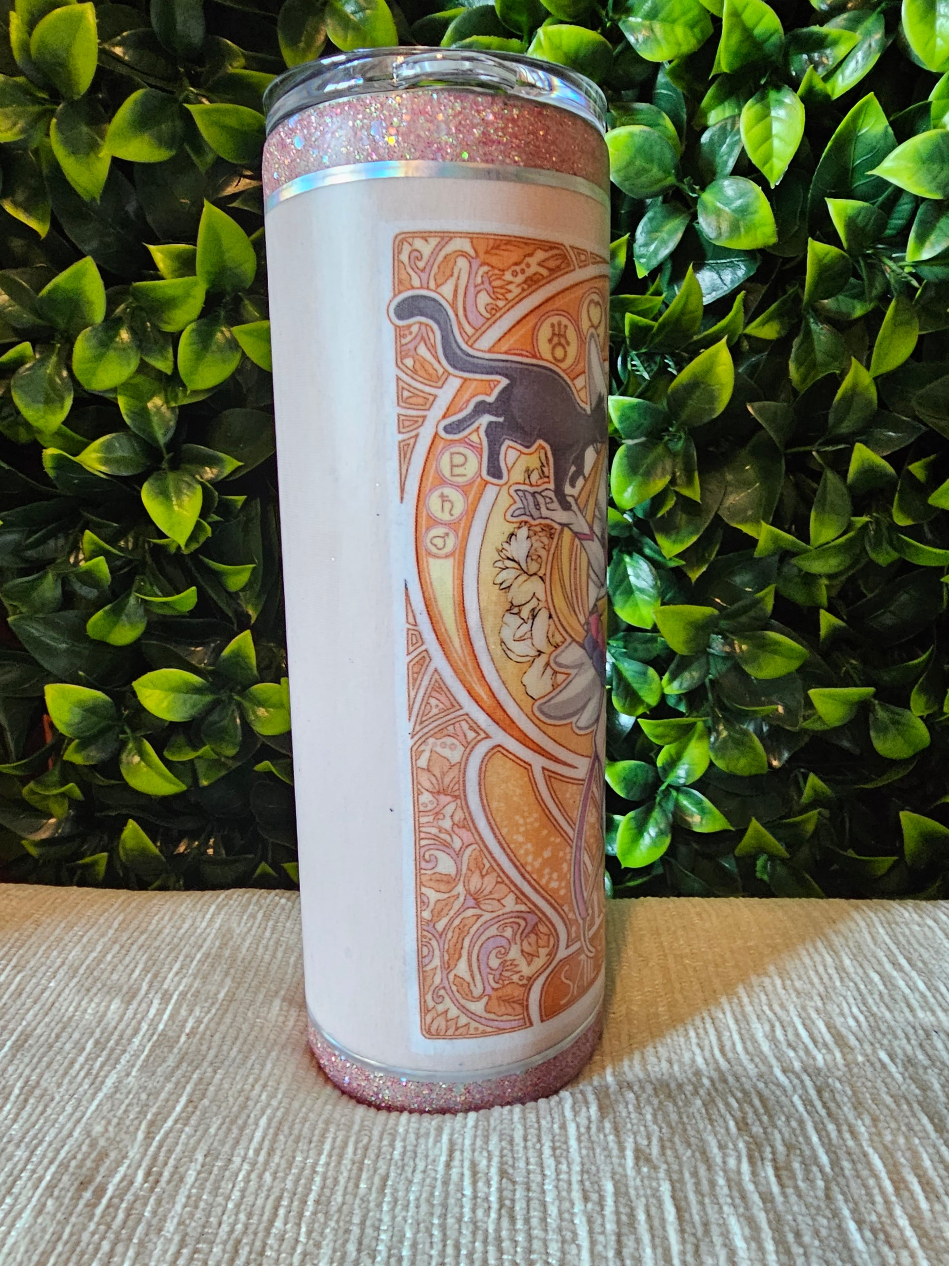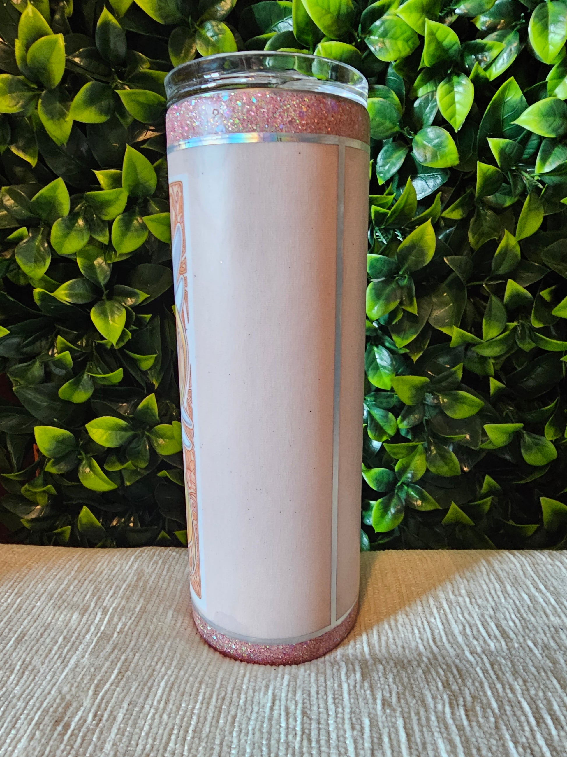 20 oz skinny stainless tumbler. Made with custom fabric and sealed with non epoxy, non toxic coating. Includes lid and straw.