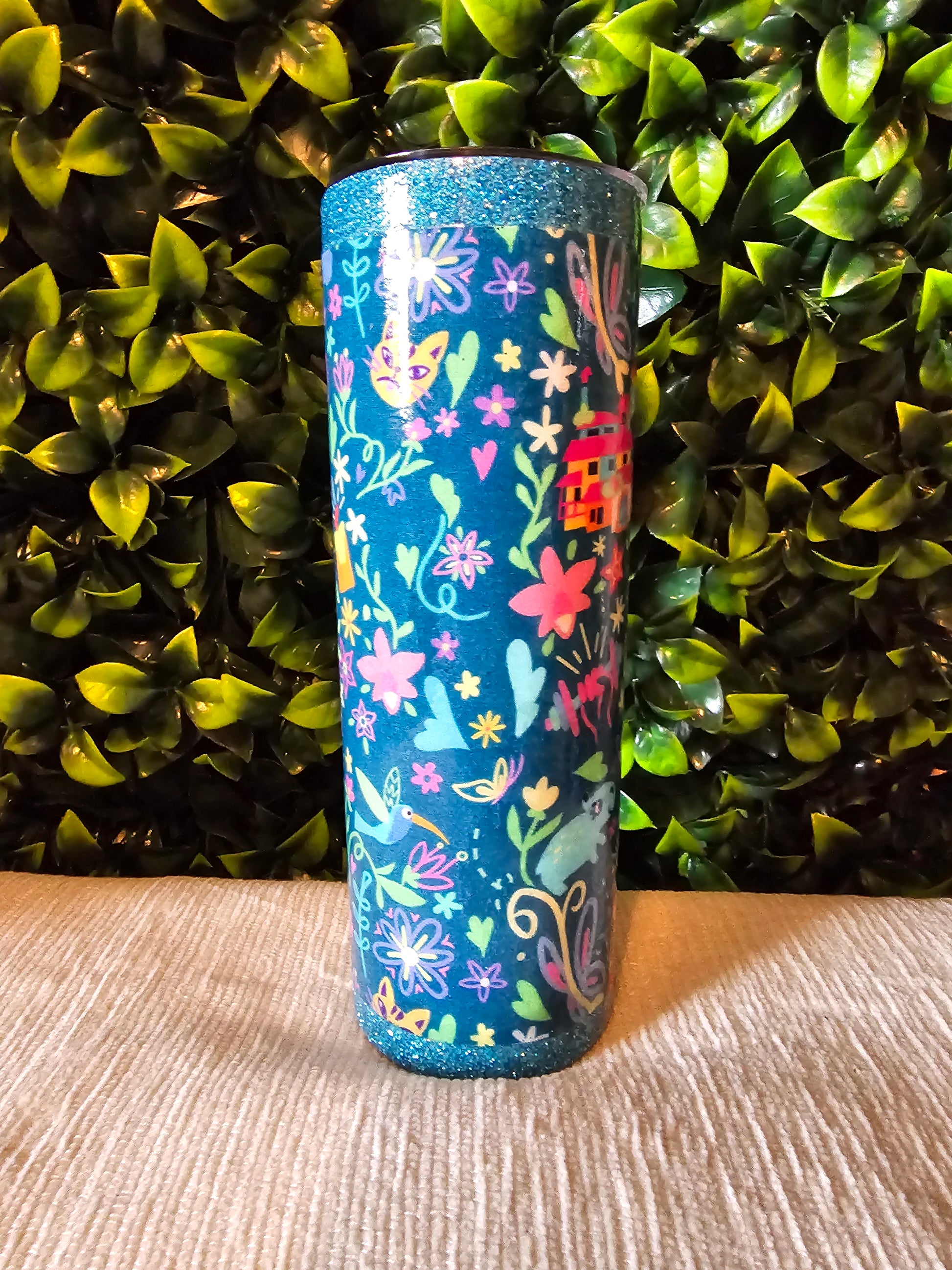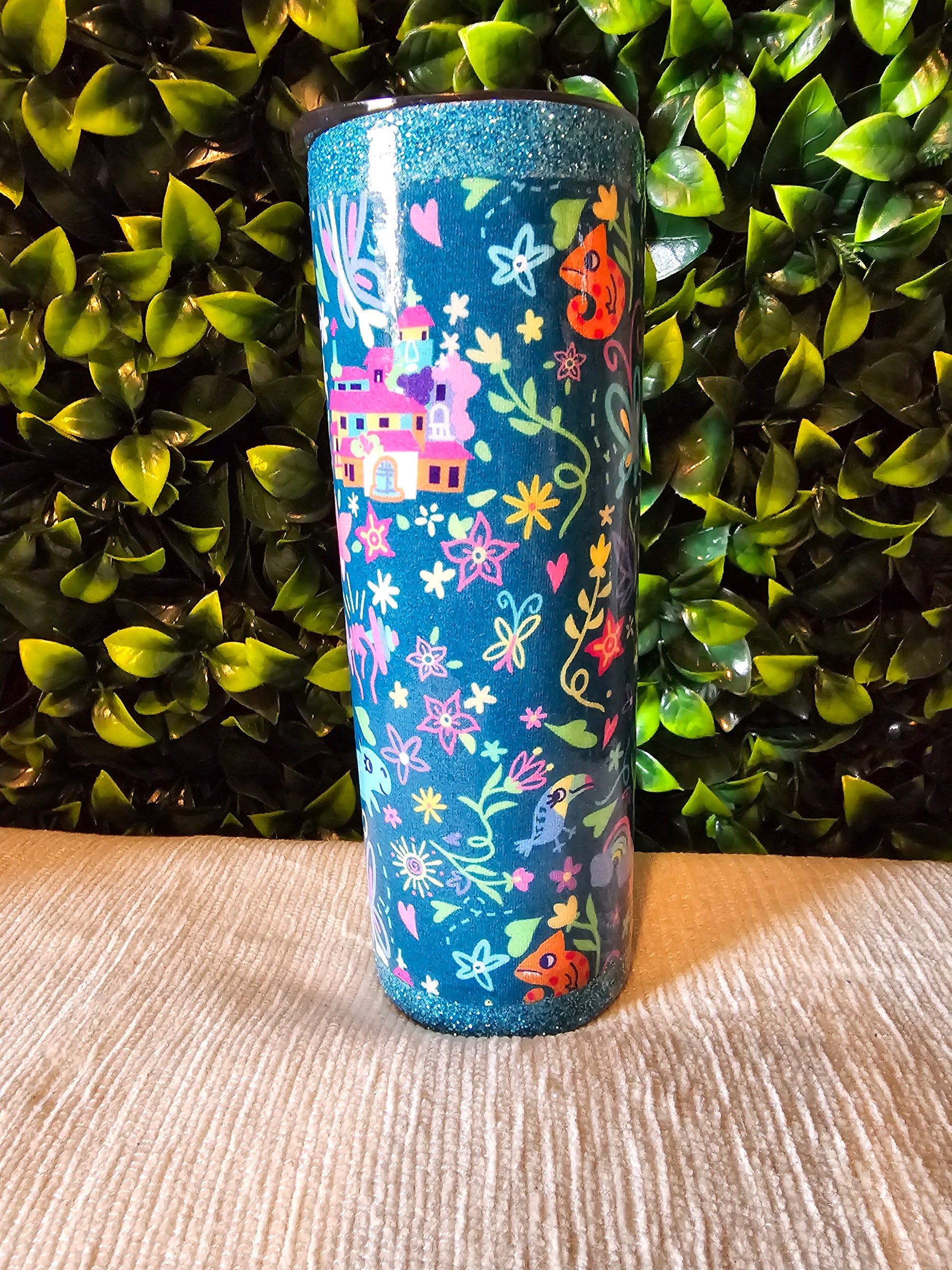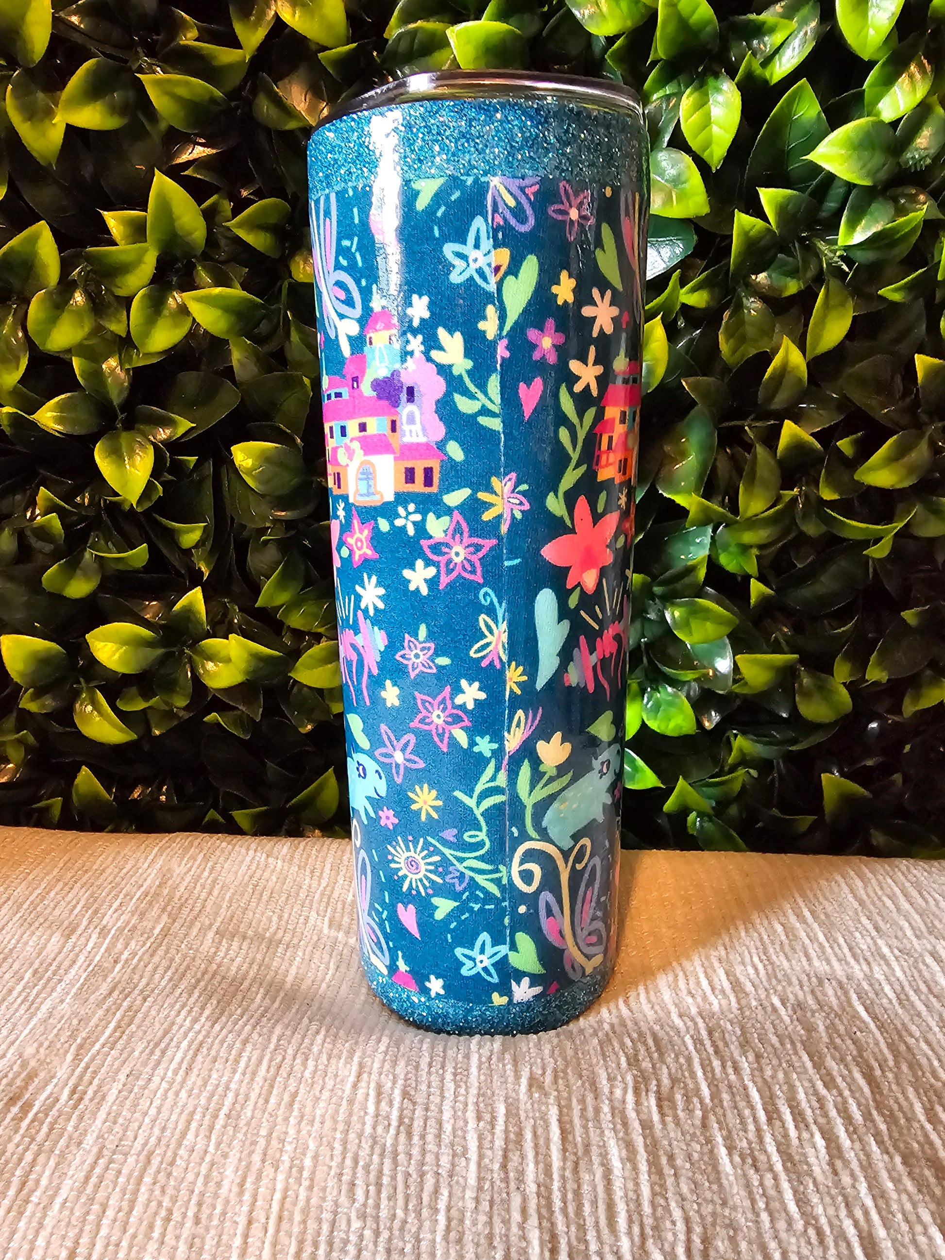 20 oz skinny stainless tumbler. Made with custom fabric and sealed with non epoxy, non toxic coating. Includes lid and straw.
