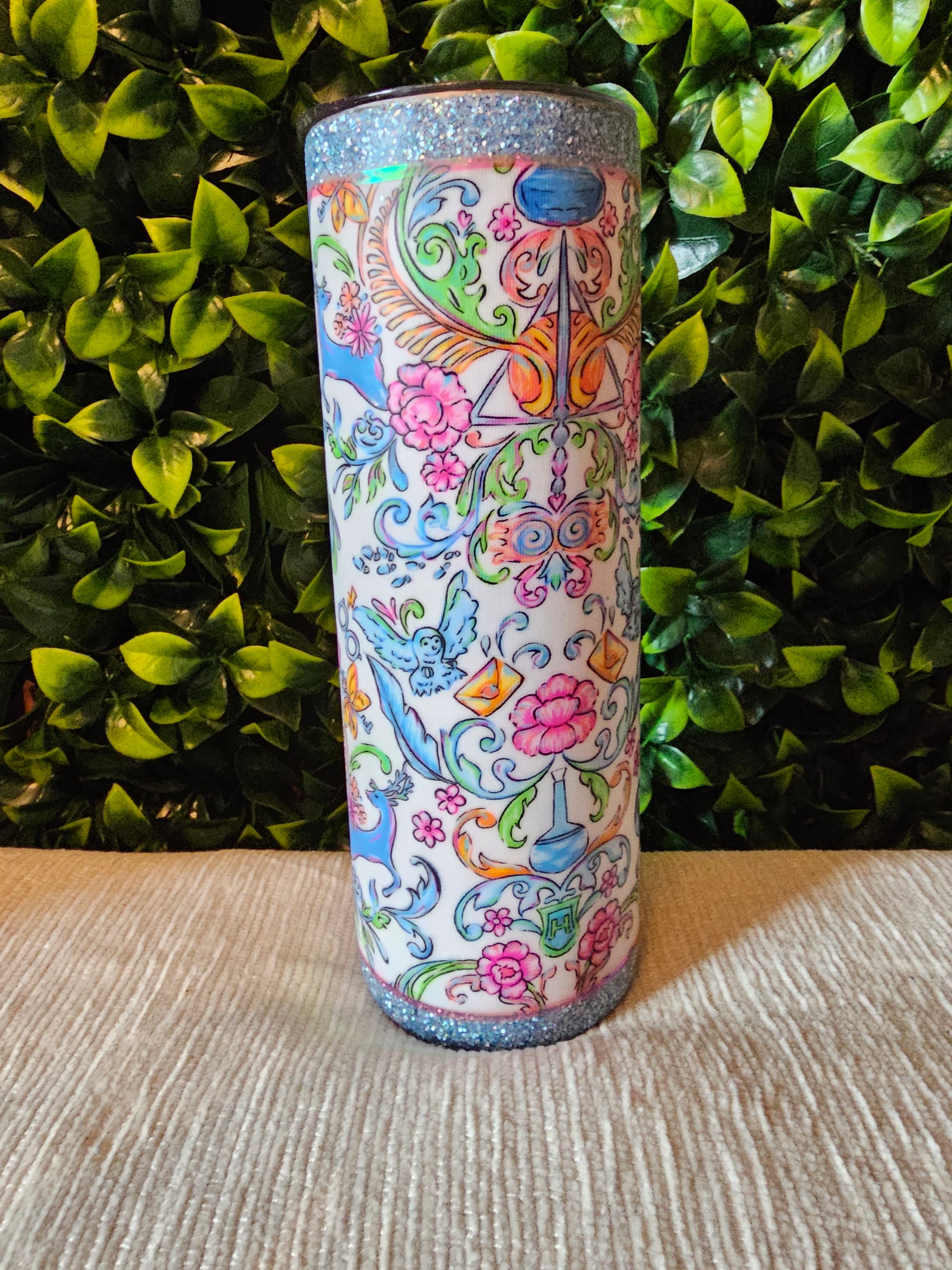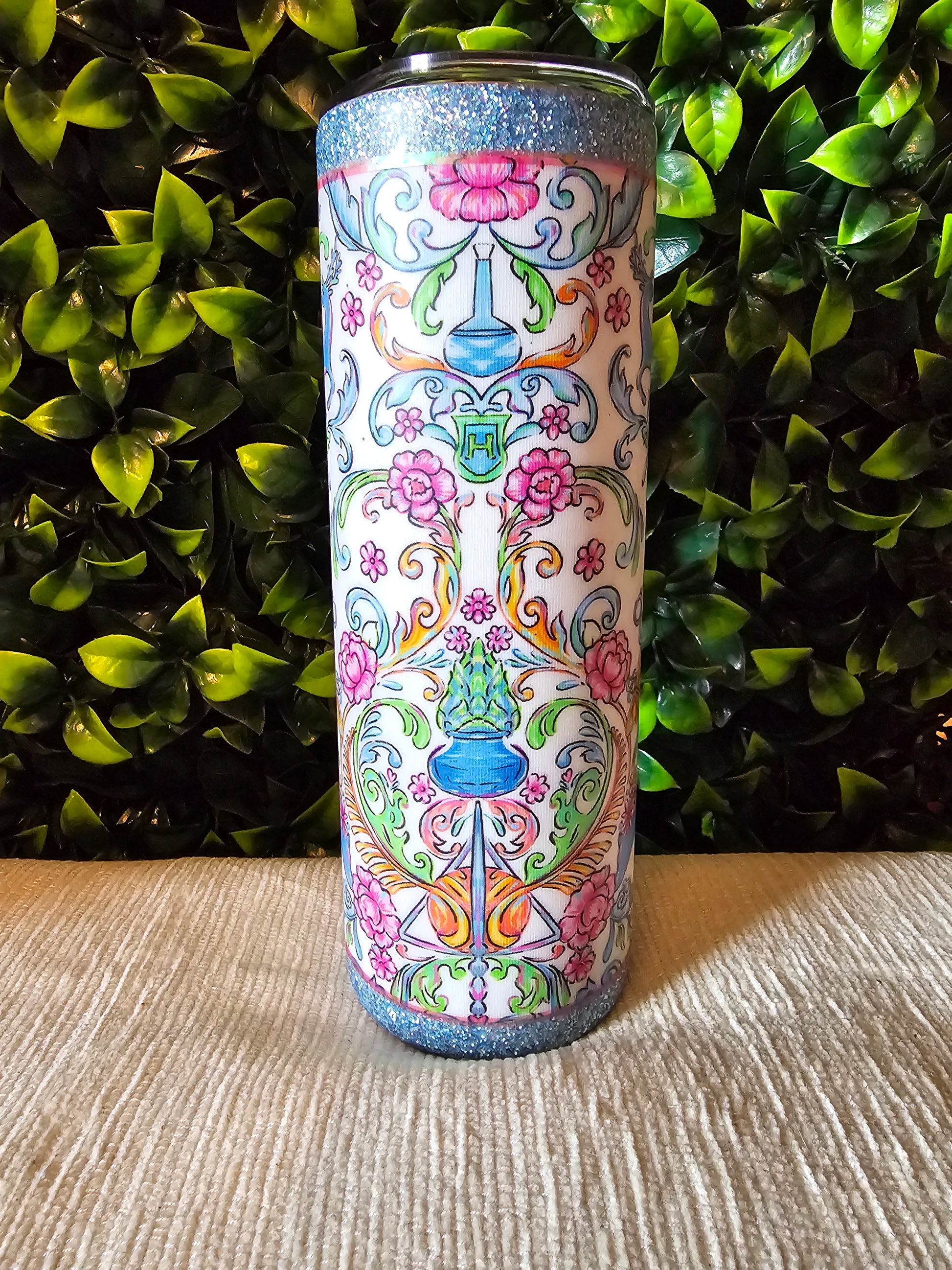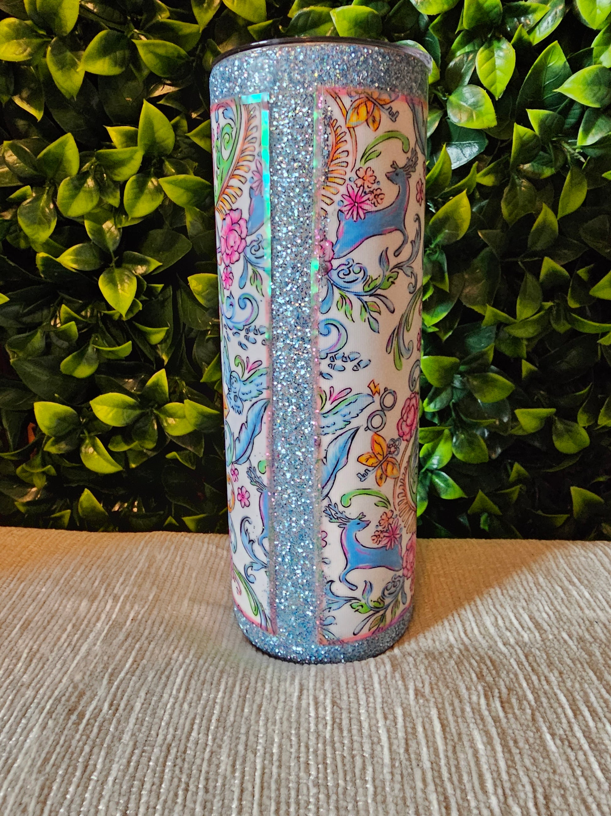 20 oz skinny stainless tumbler. Made with custom fabric and sealed with non epoxy, non toxic coating. Includes lid and straw.